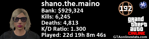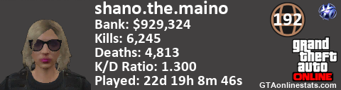 [URL=http://GTAonlinestats.com/showplayer/shano.the.maino][IMG]http://GTAonlinestats.com/signature/shano.the.maino/sig.png[/IMG][/URL]