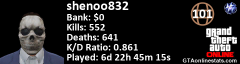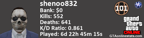<a href="http://GTAonlinestats.com/showplayer/shenoo832"><img src="http://GTAonlinestats.com/randomsignature/shenoo832/sig.png" alt="Shenoo832" border="0" /></a>