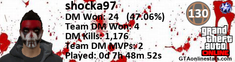 [URL=http://GTAonlinestats.com/showplayer/shocka97][IMG]http://GTAonlinestats.com/dmsignature/shocka97/sig.png[/IMG][/URL]