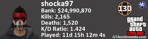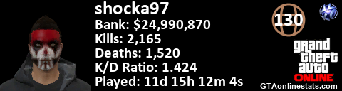 <a href="http://GTAonlinestats.com/showplayer/shocka97"><img src="http://GTAonlinestats.com/randomsignature/shocka97/sig.png" alt="shocka97" border="0" /></a>
