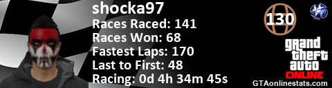 [URL=http://GTAonlinestats.com/showplayer/shocka97][IMG]http://GTAonlinestats.com/racesignature/shocka97/sig.png[/IMG][/URL]