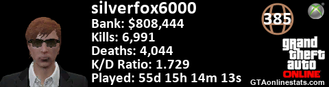 [URL=http://GTAonlinestats.com/showplayer/silverfox6000][IMG]http://GTAonlinestats.com/signature/silverfox6000/sig.png[/IMG][/URL]