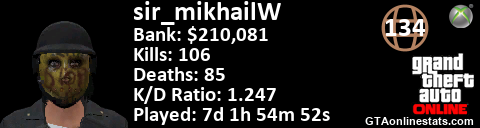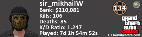 [URL=http://GTAonlinestats.com/showplayer/sir_mikhailW][IMG]http://GTAonlinestats.com/signature/sir_mikhailW/sig.png[/IMG][/URL]