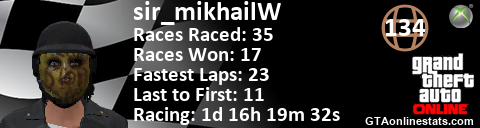 [URL=http://GTAonlinestats.com/showplayer/sir_mikhailW][IMG]http://GTAonlinestats.com/racesignature/sir_mikhailW/sig.png[/IMG][/URL]