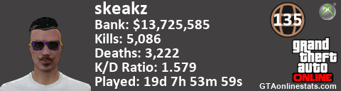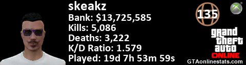 [URL=http://GTAonlinestats.com/showplayer/skeakz][IMG]http://GTAonlinestats.com/signature/skeakz/sig.png[/IMG][/URL]