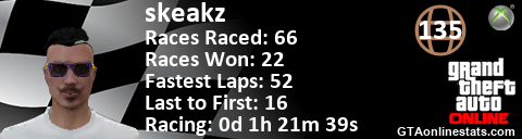 [URL=http://GTAonlinestats.com/showplayer/skeakz][IMG]http://GTAonlinestats.com/racesignature/skeakz/sig.png[/IMG][/URL]