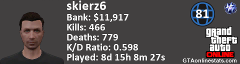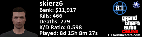 [URL=http://GTAonlinestats.com/showplayer/skierz6][IMG]http://GTAonlinestats.com/signature/skierz6/sig.png[/IMG][/URL]