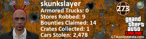 [URL=http://GTAonlinestats.com/showplayer/skunkslayer][IMG]http://GTAonlinestats.com/crimesignature/skunkslayer/sig.png[/IMG][/URL]