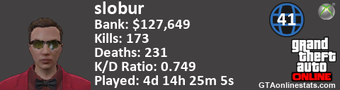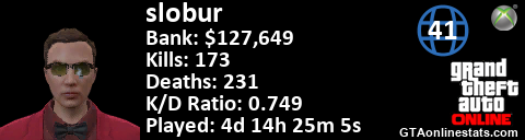 <a href="http://GTAonlinestats.com/showplayer/slobur"><img src="http://GTAonlinestats.com/dmsignature/slobur/sig.png" alt="Slobur" border="0" /></a>