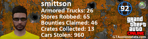 [URL=http://GTAonlinestats.com/showplayer/smittson][IMG]http://GTAonlinestats.com/randomsignature/smittson/sig.png[/IMG][/URL]