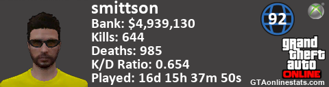 [URL=http://GTAonlinestats.com/showplayer/smittson][IMG]http://GTAonlinestats.com/dmsignature/smittson/sig.png[/IMG][/URL]