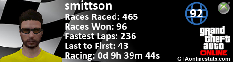 [URL=http://GTAonlinestats.com/showplayer/smittson][IMG]http://GTAonlinestats.com/racesignature/smittson/sig.png[/IMG][/URL]
