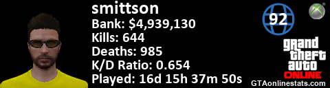 <a href="http://GTAonlinestats.com/showplayer/smittson"><img src="http://GTAonlinestats.com/signature/smittson/sig.png" alt="smittson" border="0" /></a>