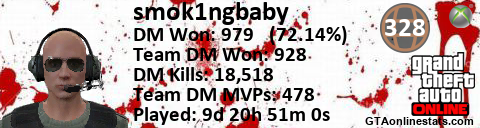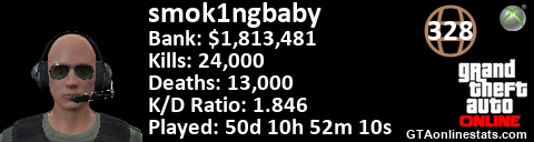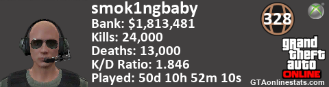 <a href="http://GTAonlinestats.com/showplayer/smok1ngbaby"><img src="http://GTAonlinestats.com/signature/smok1ngbaby/sig.png" alt="SMOK1NGBABY" border="0" /></a>
