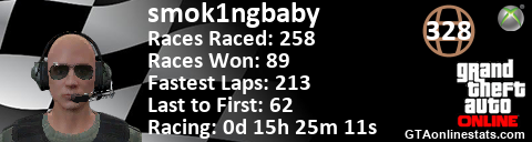 <a href="http://GTAonlinestats.com/showplayer/smok1ngbaby"><img src="http://GTAonlinestats.com/racesignature/smok1ngbaby/sig.png" alt="SMOK1NGBABY" border="0" /></a>