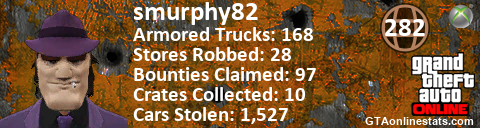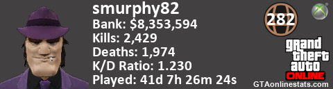 [URL=http://GTAonlinestats.com/showplayer/smurphy82][IMG]http://GTAonlinestats.com/signature/smurphy82/sig.png[/IMG][/URL]