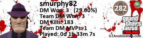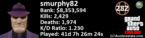 <a href="http://GTAonlinestats.com/showplayer/smurphy82"><img src="http://GTAonlinestats.com/randomsignature/smurphy82/sig.png" alt="smurphy82" border="0" /></a>