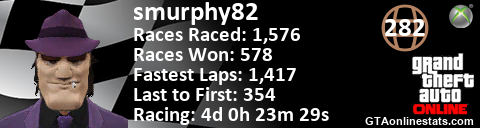 [URL=http://GTAonlinestats.com/showplayer/smurphy82][IMG]http://GTAonlinestats.com/racesignature/smurphy82/sig.png[/IMG][/URL]