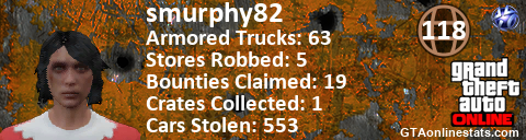 [URL=http://GTAonlinestats.com/showplayer/smurphy82/2][IMG]http://GTAonlinestats.com/randomsignature/smurphy82/2/sig.png[/IMG][/URL]