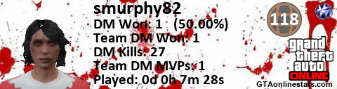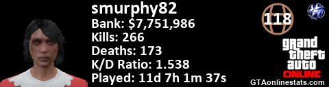 [URL=http://GTAonlinestats.com/showplayer/smurphy82/2][IMG]http://GTAonlinestats.com/signature/smurphy82/2/sig.png[/IMG][/URL]