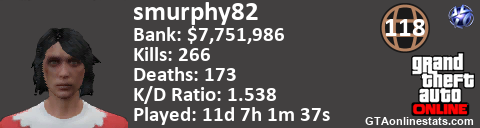 [URL=http://GTAonlinestats.com/showplayer/smurphy82/2][IMG]http://GTAonlinestats.com/greysignature/smurphy82/2/sig.png[/IMG][/URL]