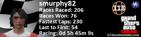 [URL=http://GTAonlinestats.com/showplayer/smurphy82/2][IMG]http://GTAonlinestats.com/racesignature/smurphy82/2/sig.png[/IMG][/URL]
