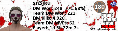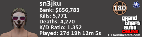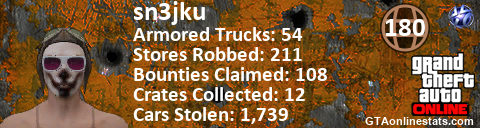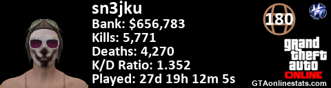 <a href="http://GTAonlinestats.com/showplayer/sn3jku"><img src="http://GTAonlinestats.com/randomsignature/sn3jku/sig.png" alt="sn3jku" border="0" /></a>