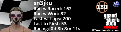 <a href="http://GTAonlinestats.com/showplayer/sn3jku"><img src="http://GTAonlinestats.com/racesignature/sn3jku/sig.png" alt="sn3jku" border="0" /></a>