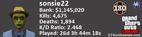 <a href="http://GTAonlinestats.com/showplayer/sonsie22"><img src="http://GTAonlinestats.com/dmsignature/sonsie22/sig.png" alt="sonsie22" border="0" /></a>
