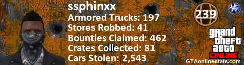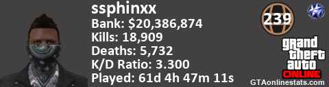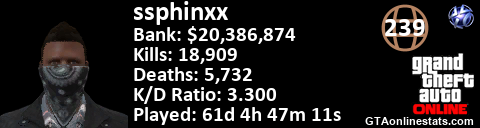 <a href="http://GTAonlinestats.com/showplayer/ssphinxx"><img src="http://GTAonlinestats.com/signature/ssphinxx/sig.png" alt="ssphinxx" border="0" /></a>