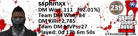 [URL=http://GTAonlinestats.com/showplayer/ssphinxx][IMG]http://GTAonlinestats.com/dmsignature/ssphinxx/sig.png[/IMG][/URL]