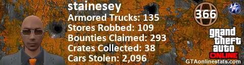 <a href="http://GTAonlinestats.com/showplayer/stainesey"><img src="http://GTAonlinestats.com/randomsignature/stainesey/sig.png" alt="stainesey" border="0" /></a>