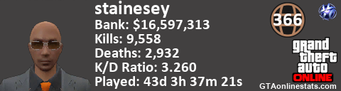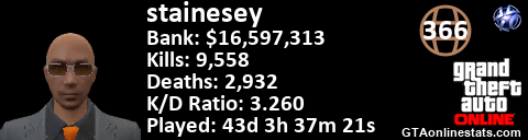 <a href="http://GTAonlinestats.com/showplayer/stainesey"><img src="http://GTAonlinestats.com/dmsignature/stainesey/sig.png" alt="stainesey" border="0" /></a>
