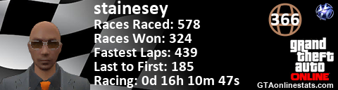[URL=http://GTAonlinestats.com/showplayer/stainesey][IMG]http://GTAonlinestats.com/racesignature/stainesey/sig.png[/IMG][/URL]