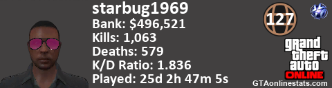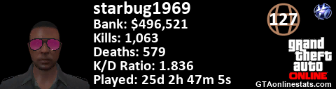 <a href="http://GTAonlinestats.com/showplayer/starbug1969"><img src="http://GTAonlinestats.com/signature/starbug1969/sig.png" alt="starbug1969" border="0" /></a>