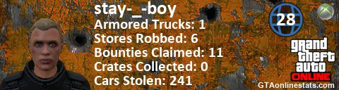 [URL=http://GTAonlinestats.com/showplayer/stay-_-boy][IMG]http://GTAonlinestats.com/crimesignature/stay-_-boy/sig.png[/IMG][/URL]