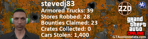 <a href="http://GTAonlinestats.com/showplayer/stevedj83"><img src="http://GTAonlinestats.com/randomsignature/stevedj83/sig.png" alt="stevedj83" border="0" /></a>