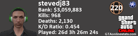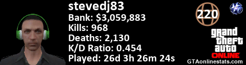 <a href="http://GTAonlinestats.com/showplayer/stevedj83"><img src="http://GTAonlinestats.com/signature/stevedj83/sig.png" alt="stevedj83" border="0" /></a>