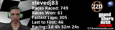 [URL=http://GTAonlinestats.com/showplayer/stevedj83][IMG]http://GTAonlinestats.com/racesignature/stevedj83/sig.png[/IMG][/URL]