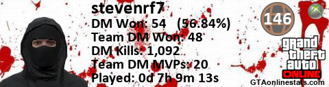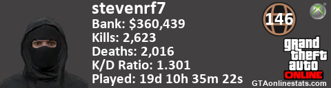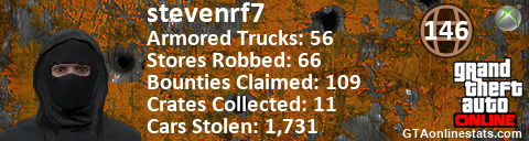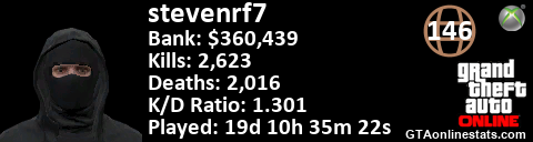 <a href="http://GTAonlinestats.com/showplayer/stevenrf7"><img src="http://GTAonlinestats.com/randomsignature/stevenrf7/sig.png" alt="stevenrf7" border="0" /></a>