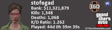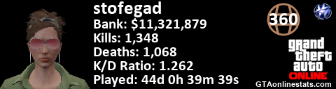 <a href="http://GTAonlinestats.com/showplayer/stofegad"><img src="http://GTAonlinestats.com/randomsignature/stofegad/sig.png" alt="stofegad" border="0" /></a>