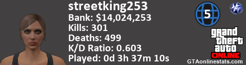 [URL=http://GTAonlinestats.com/showplayer/streetking253/3][IMG]http://GTAonlinestats.com/signature/streetking253/3/sig.png[/IMG][/URL]