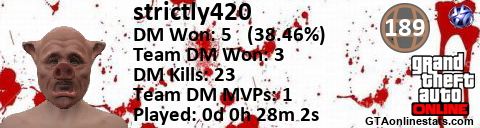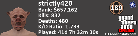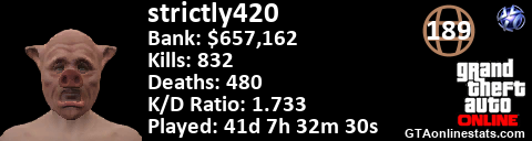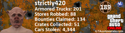 [URL=http://GTAonlinestats.com/showplayer/strictly420][IMG]http://GTAonlinestats.com/signature/strictly420/sig.png[/IMG][/URL]