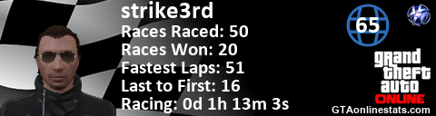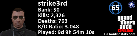 <a href="http://GTAonlinestats.com/showplayer/strike3rd"><img src="http://GTAonlinestats.com/randomsignature/strike3rd/sig.png" alt="strike3rd" border="0" /></a>