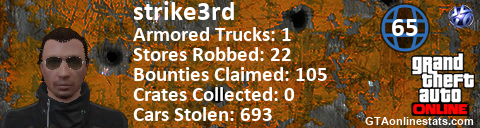 [URL=http://GTAonlinestats.com/showplayer/strike3rd][IMG]http://GTAonlinestats.com/crimesignature/strike3rd/sig.png[/IMG][/URL]