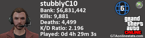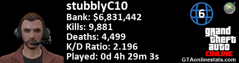 <a href="http://GTAonlinestats.com/showplayer/stubblyC10/2"><img src="http://GTAonlinestats.com/dmsignature/stubblyC10/2/sig.png" alt="stubblyC10" border="0" /></a>
