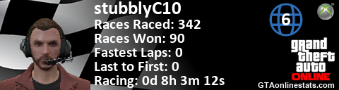 [URL=http://GTAonlinestats.com/showplayer/stubblyC10/2][IMG]http://GTAonlinestats.com/racesignature/stubblyC10/2/sig.png[/IMG][/URL]