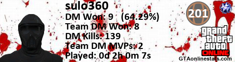 [URL=http://GTAonlinestats.com/showplayer/sulo360][IMG]http://GTAonlinestats.com/signature/sulo360/sig.png[/IMG][/URL]