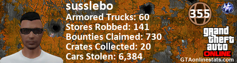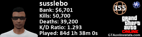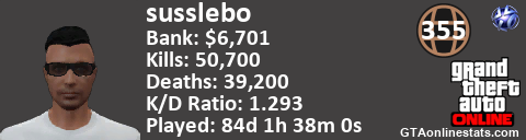 <a href="http://GTAonlinestats.com/showplayer/susslebo"><img src="http://GTAonlinestats.com/randomsignature/susslebo/sig.png" alt="Susslebo" border="0" /></a>