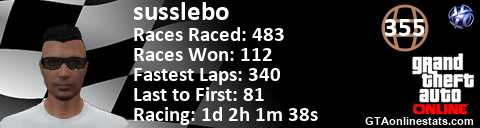 <a href="http://GTAonlinestats.com/showplayer/susslebo"><img src="http://GTAonlinestats.com/racesignature/susslebo/sig.png" alt="Susslebo" border="0" /></a>
